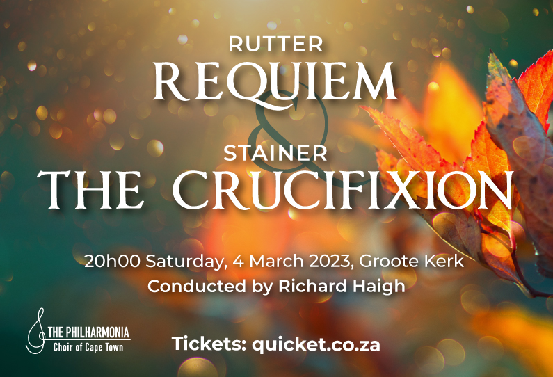 Join the Philharmonia Choir of Cape Town on Saturday 4 March at 20h00 as we perform two moving choral works: Rutter’s Requiem and Stainer’s The Crucifixion.